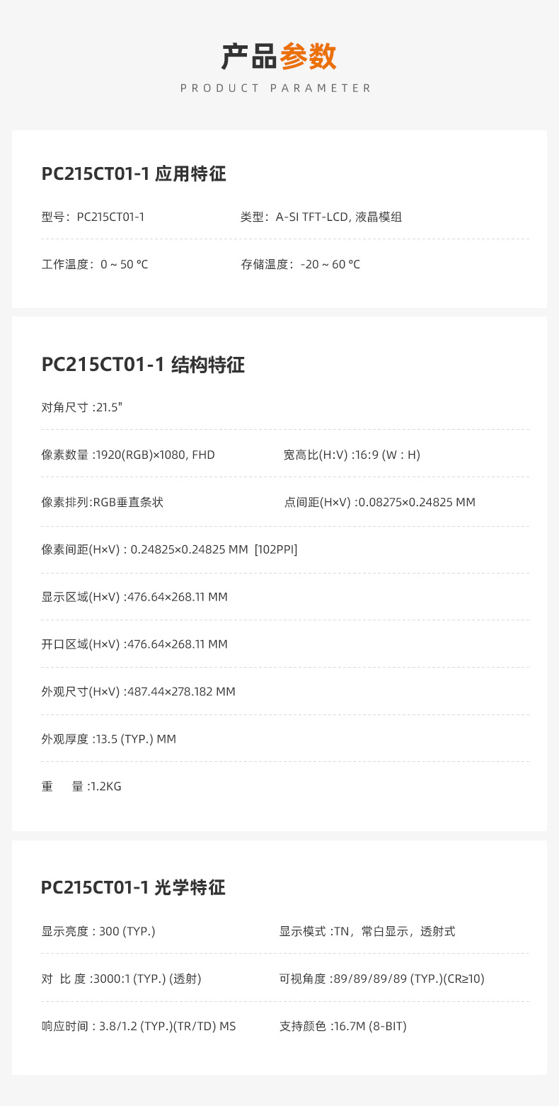 PC215CT01-1是惠科 (HKC)推出的一款21.5吋a-Si TFT-LCD液晶玻璃產(chǎn)品,它無背光,無觸摸。此產(chǎn)品工作溫度為 0 ~ 50°C,存儲溫度為 -20 ~ 60°C。PC215CT01-1采用了LVDS (2 ch, 8-bit)信號接口,總共30 pins,采用端子連接,驅屏電壓為5.0V (Typ.)。它的典型垂直刷新率Fv為60Hz。