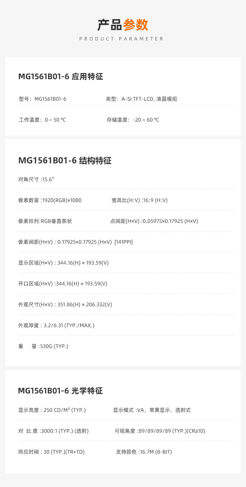 華星光電 (CSOT) 推出的MG1561B01-6是一款采用a-Si TFT-LCD技術(shù)的15.6英寸液晶模組產(chǎn)品,它裝配有WLED背光,含LED驅(qū)動(dòng)器背光驅(qū)動(dòng),無觸摸。總結(jié)它的典型特征為: 白光LED背光,含LED驅(qū)動(dòng)器,端子倒裝,表面霧面。它的工作溫度為 0 ~ 50°C,存儲(chǔ)溫度為 -20 ~ 60°C。此型號適合應(yīng)用于數(shù)字標(biāo)牌。