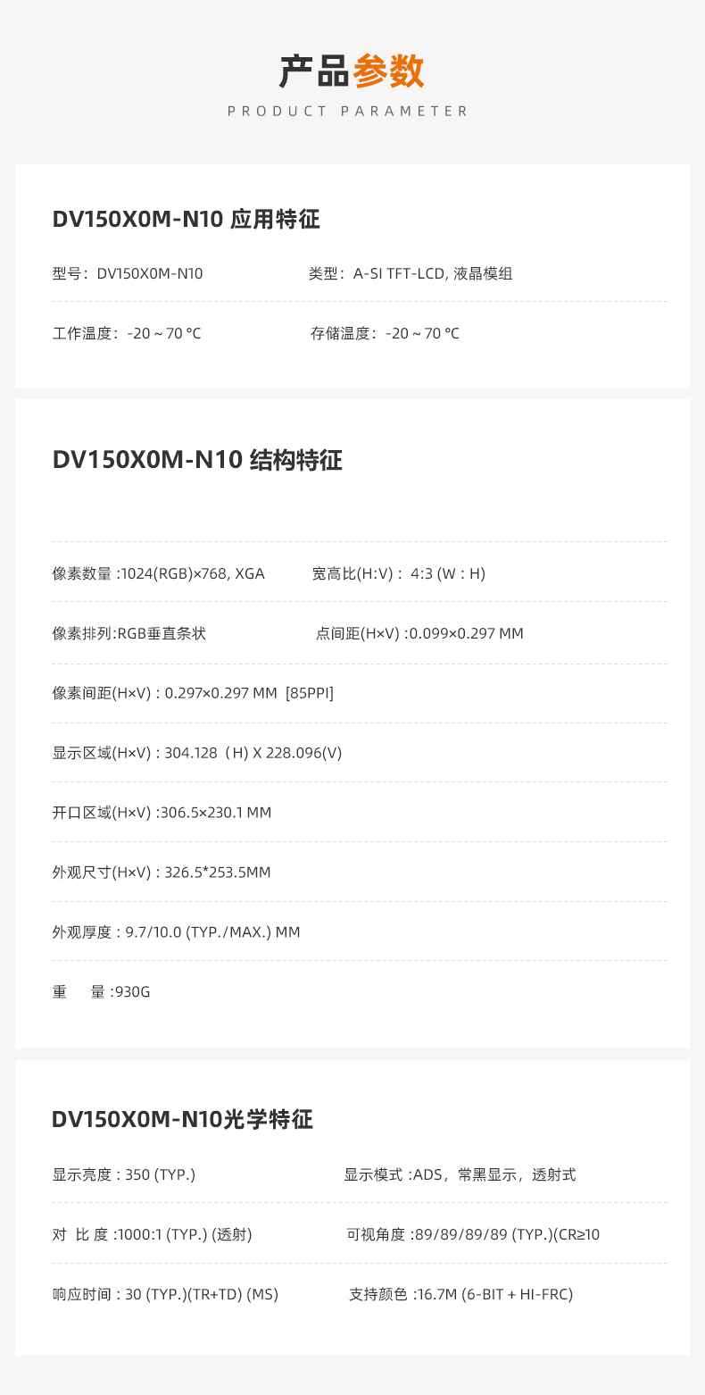 京東方DV150XOM-N10 像素:1024*768 寬高比:4:3 點間距:0.099*0.297mm 顯示亮度:350 可視角度:89/89/89/89