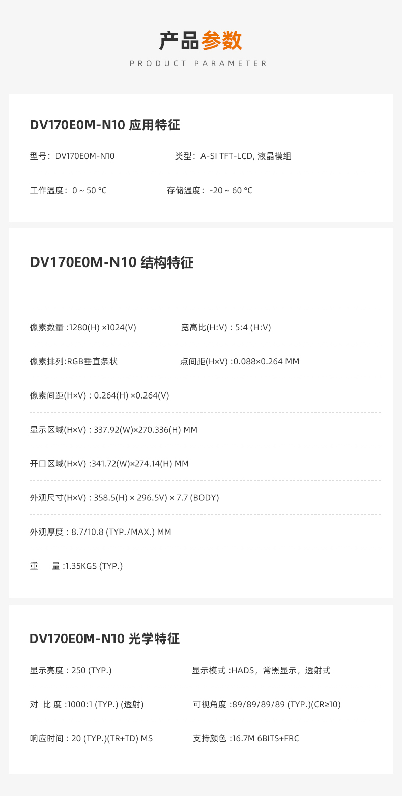 京東方DV170EOM-N10 對角尺寸:17英寸 像素:1280*1024 寬高比:4:3 點間距:0.264*0.264 顯示亮度:250 可視角度:89/89/89/89