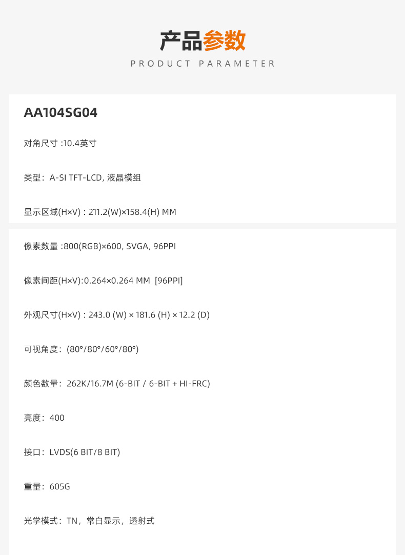 三菱 (Mitsubishi) 推出的AA104SG04是一款采用a-Si TFT-LCD技術(shù)的10.4英寸液晶模組產(chǎn)品,它裝配有CCFL背光,無背光驅(qū)動(dòng),無觸摸??偨Y(jié)它的典型特征為: 6/8位灰階可選。此型號(hào)適合應(yīng)用于工業(yè)