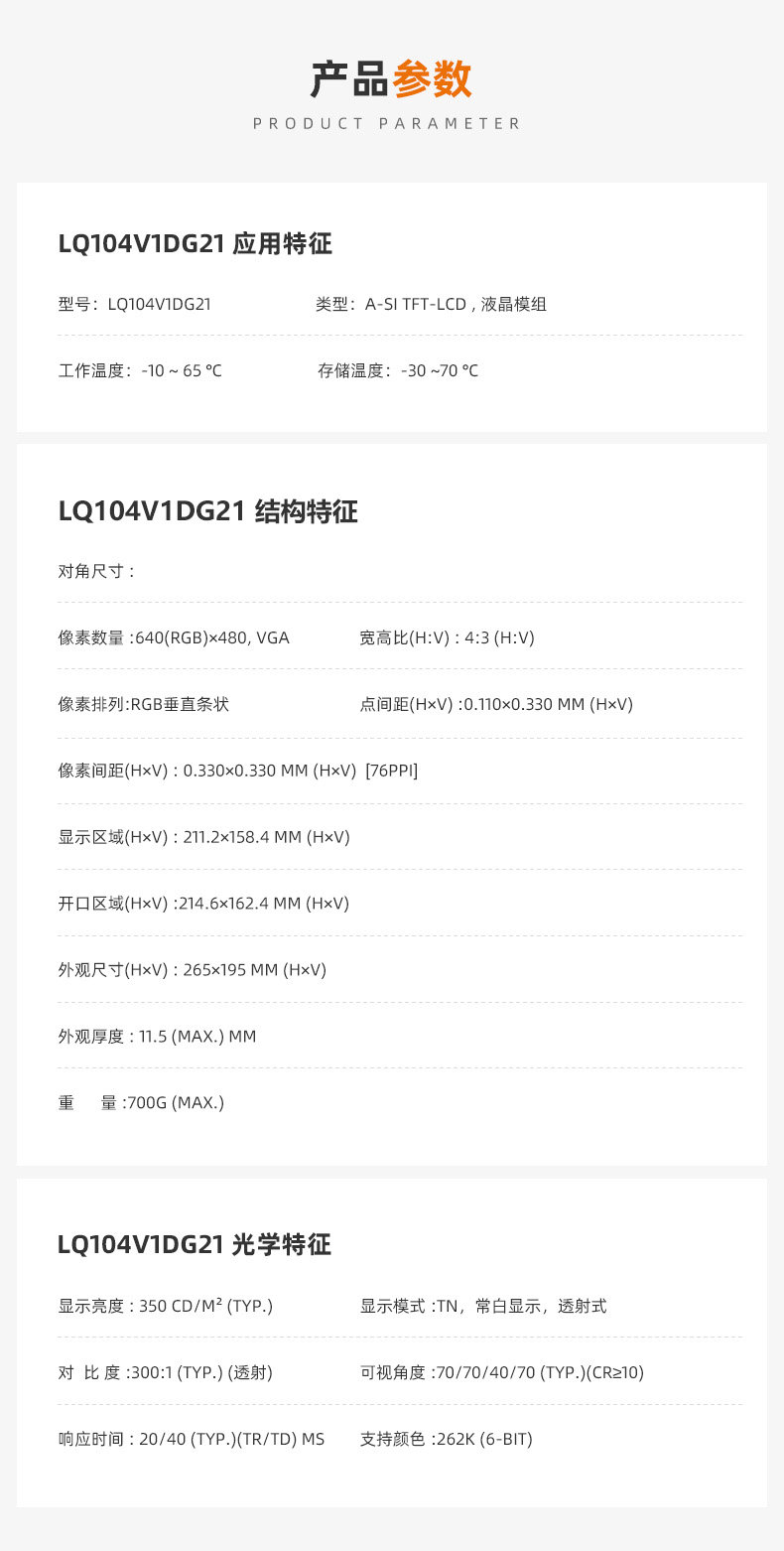 LQ104V1DG21是 (夏普,Sharp) 推出的一款采用a-Si TFT-LCD技術(shù)的10.4英寸液晶模組產(chǎn)品,它裝配有CCFL背光,無(wú)背光驅(qū)動(dòng),無(wú)觸摸。它的工作溫度為 -10 ~ 65°C,存儲(chǔ)溫度為 -30 ~ 70°C,耐振動(dòng)性為1.0G (9.8 m/s2)?;谒彻庖讚Q,壽命大于5萬(wàn)小時(shí),上/下,左/右翻轉(zhuǎn)顯示,表面霧面等特征,此型號(hào)推薦使用于工業(yè)。