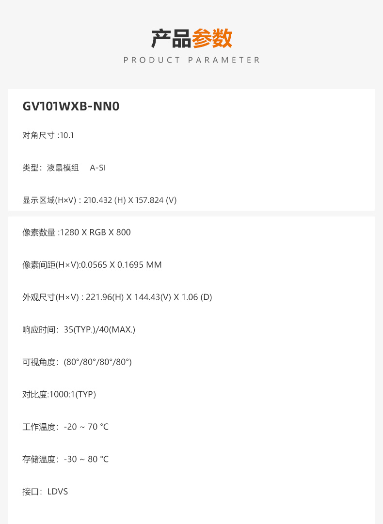 京東方GV101WXB-NN0液晶屏 對角尺寸:10.1英寸 像素:1280*800 點間距:0.0565*0.1695 可是角度:80/80/80/80