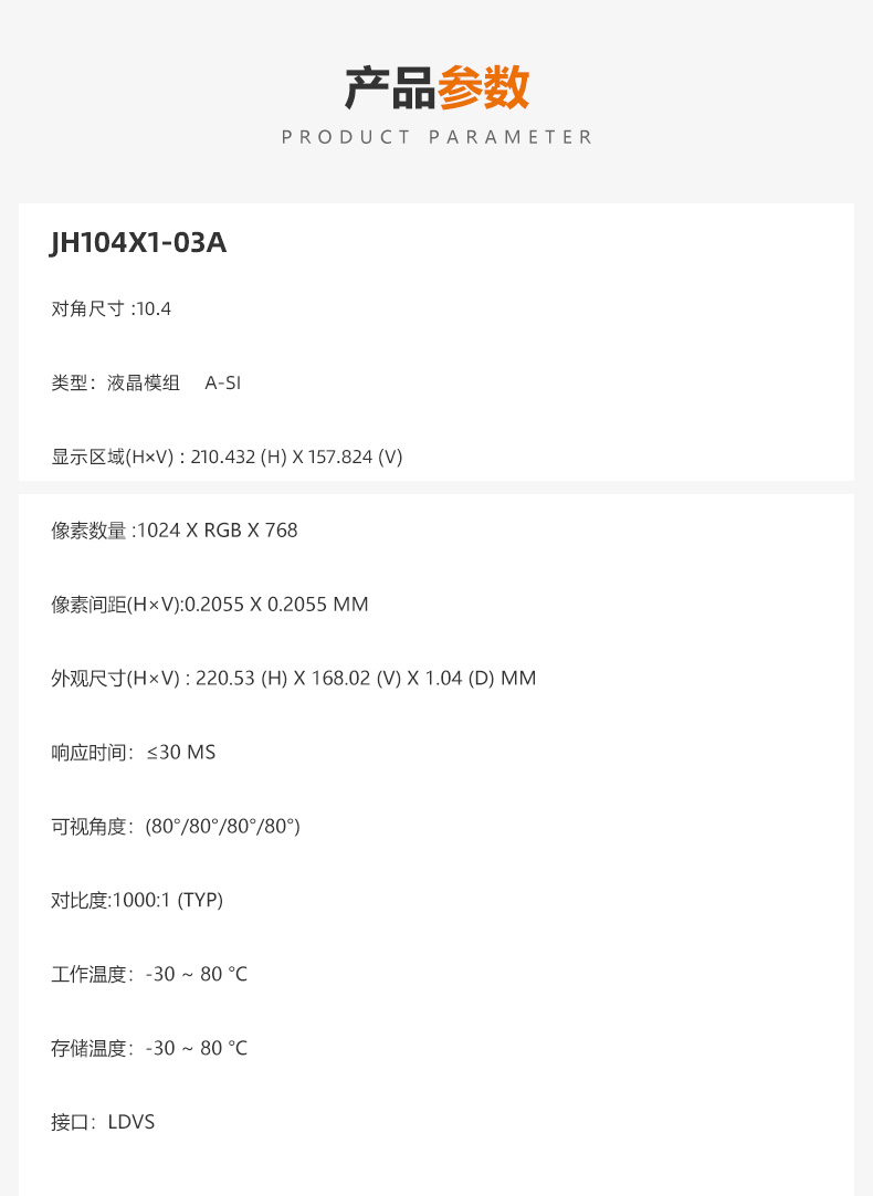 群創(chuàng)JH104X1-03A 對角尺寸:10.4英寸 像素:1024*768 點(diǎn)間距:0.2055*0.2055 可視角度:80/80/80/80