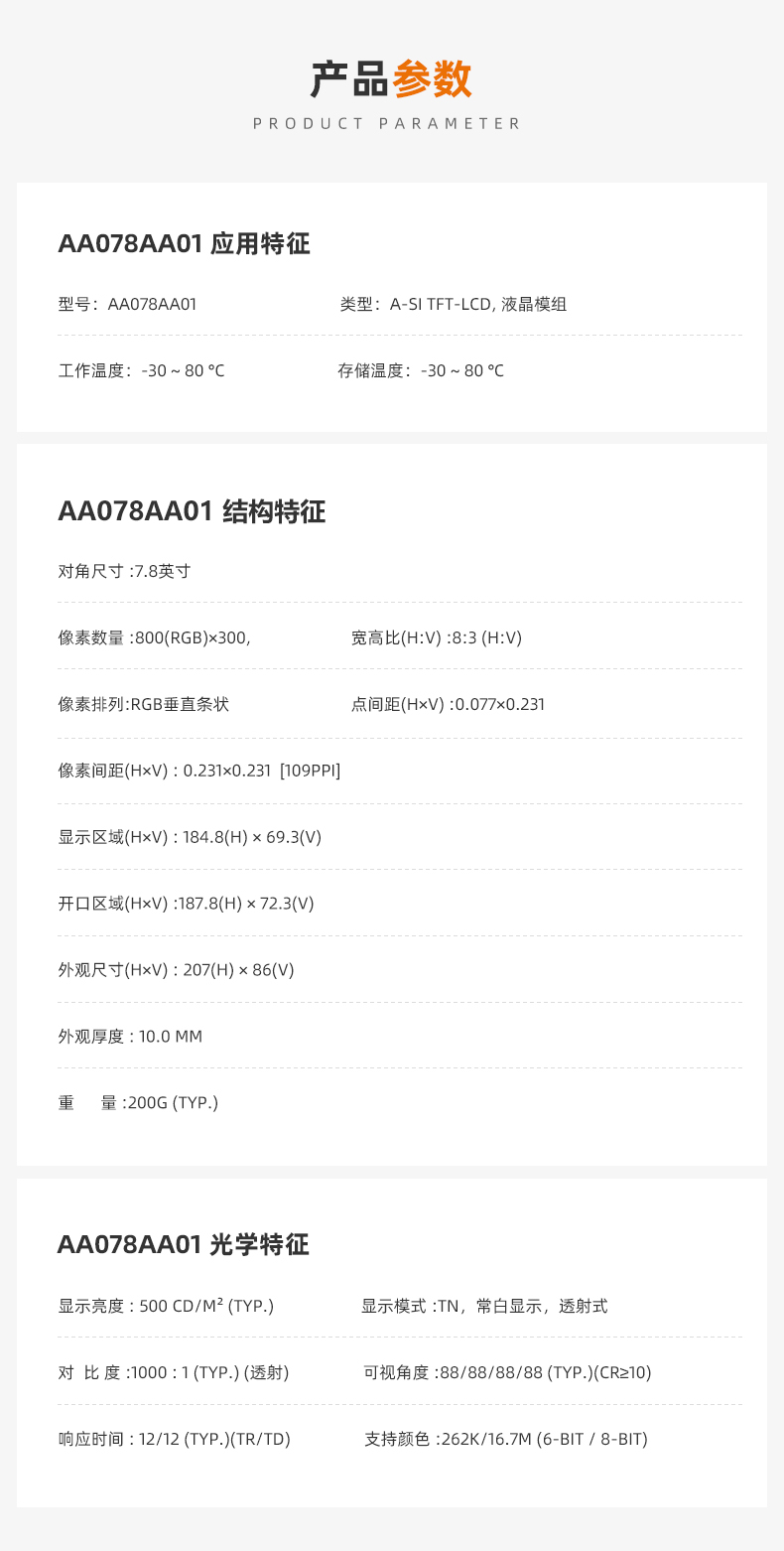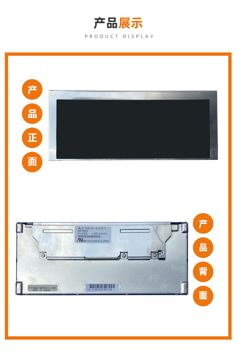 三菱AA078AA01液晶模組,工作溫度-30-80℃,800*300分辨率,8:3高寬比,500顯示亮度。