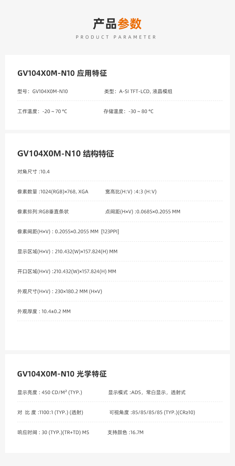 GV104X0M-N10是京東方科技集團股份有限公司 (京東方,BOE) 推出的一款采用a-Si TFT-LCD技術(shù)的10.4英寸液晶模組產(chǎn)品,它裝配有WLED背光。